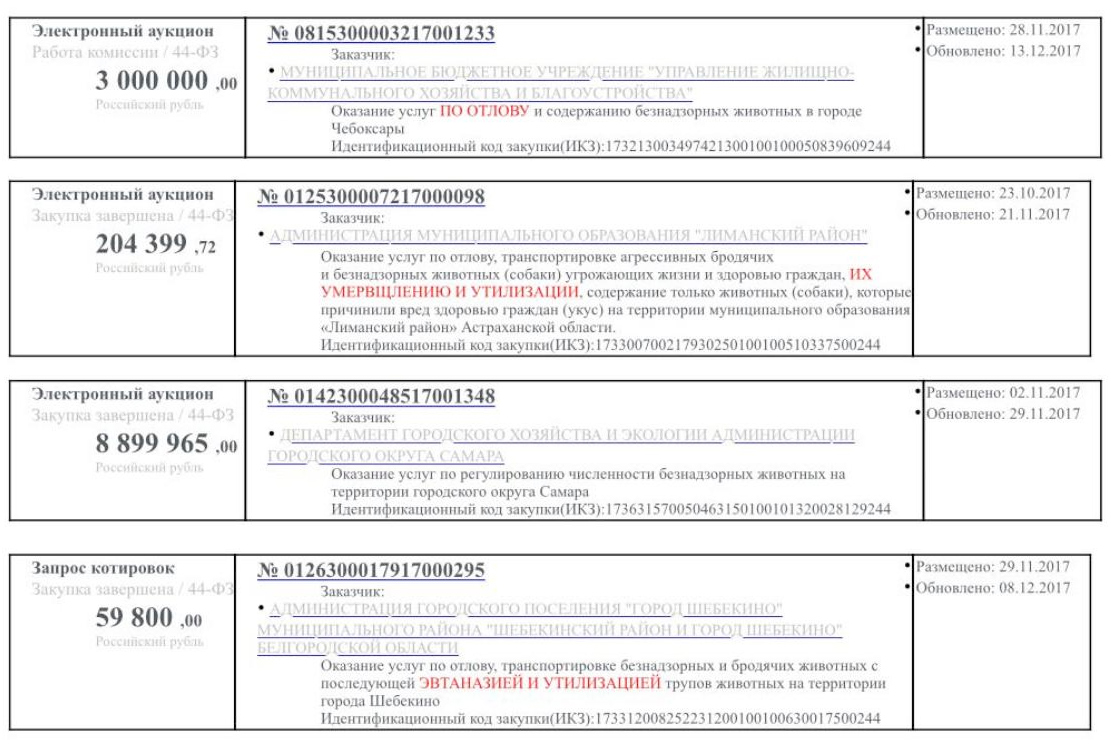 Но дело не только в том, что FIFA опасается штрафов и недовольства покусанных. Надуманная угроза для болельщиков – отличный предлог для распила бюджетных денег. Глава Фонда защиты городских животных Екатерина Дмитриева изучила сайт госзакупок и подсчитала, что в регионах, где запланированы матчи чемпионата и расположены тренировочные базы, будет потрачено более 100 миллионов рублей на истребление собак и кошек. Где-то, как в Волгограде и Астрахани, говорится об "умерщвлении", в других городах об "усыплении" или "утилизации трупов".