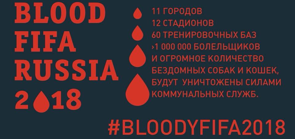 "В 2018 году 11 городов России будут утоплены в крови бездомных животных. Почему их ВСЕХ уничтожат? Да потому, что чиновники и коммунальщики, кроме остервенелого желания убивать, гнать и уничтожать все живое, уверены, что животные мешают спортсменам и болельщикам, что животные портят "туристическую привлекательность". Они мечтают о пластиковом мире без листвы, травы на газонах, о мире без животных и птиц. Они считают, что животные не имеют права на жизнь!" – пишут участники сообщества BloodyFifa2018. Ответ на вопрос, зачем нужна эта жестокость, дается тут же: "чтобы собаки не укусили никого из футбольных фанатов, которые могут подать в суд на FIFA и потребовать возмещения ущерба".