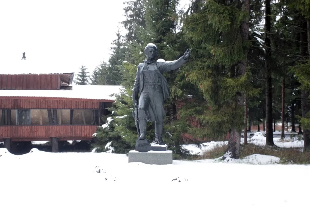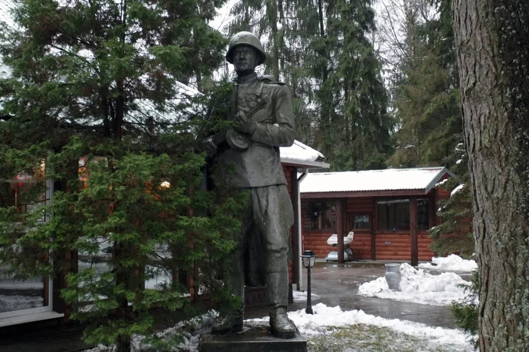 На подъезде к парку издалека видно смотровую вышку метров десяти в высоту: кукла солдата в военном мундире советского покроя охраняет вход в парк. Сейчас охранять особо не от кого: в дирекции парка говорят, что ежегодная проходимость — более 100 тысяч туристов, но это весной и летом, а зимой здесь пусто, безлюдно и промозгло. Раньше здесь были болота и леса — болота осушили, а густая хвоя так и осталась мрачной декорацией к памятникам.