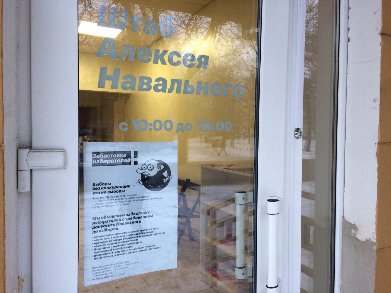 В Пскове волонтеры трижды столкнулись с противодействием властей. Первый раз 17 января, когда по приказу ФСБ у транспортной компании были изъяты листовки с призывом поддержать «забастовку избирателей», которые ехали в местный штаб из Питера.