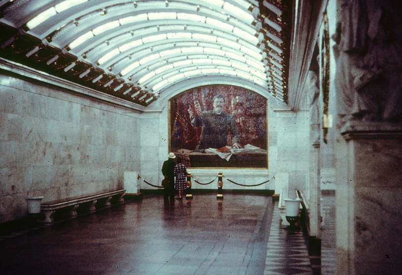 Откуда это пошло? Всё очень просто: на станции по изначальному проекту предполагалось разместить два художественных произведения, связанных со Сталиным: мозаичное панно, которое в итоге было поставлено и находилось там до 1962 года, и горельеф — наверху в наземном вестибюле, там, куда поднимается эскалатор. В центре горельефа должна была стоять фигура Иосифа Виссарионовича Сталина. Но его не поставили. Причем, как я предполагаю, в последний момент фигуру вождя просто не стали ваять: общий антураж сохранился — это группа рабочих, жителей города, которые идут на демонстрацию. Сейчас в центре [панно] безликий, никому не известный мужчина, который несет знамя с надписью «Слава труду», — и все смотрят на него. Но есть фотографии макета оригинального вида композиции, где отчетливо видна фигура вождя.