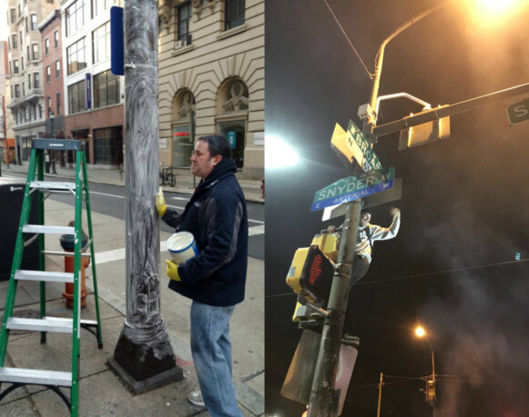 В Филадельфии смазали фонарные столбы, чтобы футбольные фанаты на них не влезали, но это не помогло