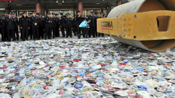 Представители Национального бюро против порнографии Китая наблюдают, как каток давит DVD-диски с порно. Фото Reuters