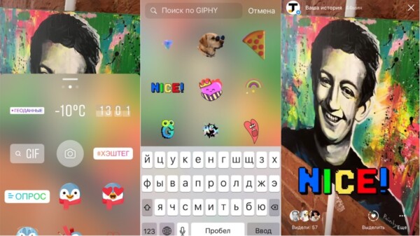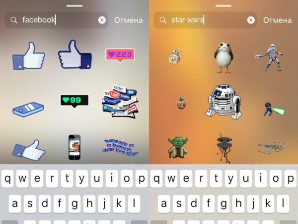 В «Истории» внедрили галерею из нескольких сотен анимированных стикеров из библиотеки Giphy. Пользователь cоцсети может выбрать одно из самых популярных изображений (в разделе «В тренде») или найти гифку через поиск по теме. Собственный стикер добавить нельзя.