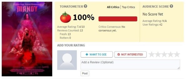 Однако «Мэнди» понравился журналистам, побывавшим на «Сандэнсе». Все 13 критиков, среди которых представители изданий The Verge и Varierty, похвалили хоррор с Кейджем, из-за чего рейтинг фильма на Rotten Tomatoes на момент написания заметки составляет 100%.