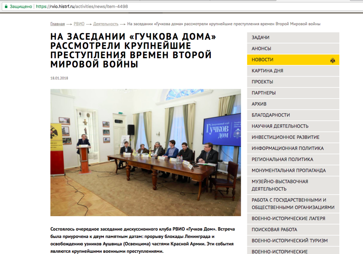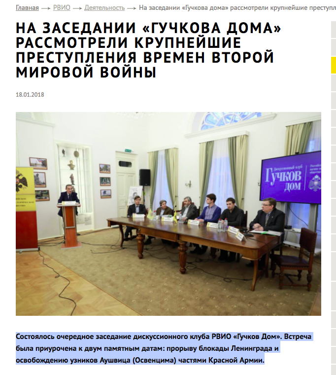 Спустя час после публикации новости на сайте РВИО из этого абзаца исключили предложение о преступлениях. Теперь он выглядит так: «Состоялось очередное заседание дискуссионного клуба РВИО „Гучков Дом“. Встреча была приурочена к двум памятным датам: прорыву блокады Ленинграда и освобождению узников Аушвица (Освенцима) частями Красной Армии».