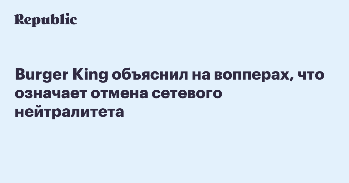 Сеть ресторанов быстрого питания Burger King сняла рекламный ролик, чтобы проиллюстрировать, как на потребителей повлияет отмена сетевого нейтралитета, которая обсуждается сейчас в США. Ролик опубликован на YouTube 24 января, на него обратил внимание The Verge.