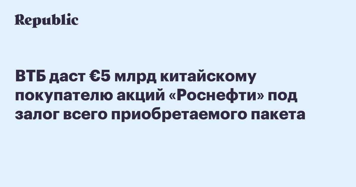 ВТБ даст €5 млрд китайскому покупателю акций «Роснефти» под залог всего приобретаемого пакета