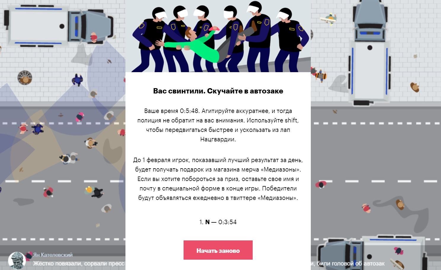 «Медиазона» выпустила игру «Симулятор протеста», в которой пользователю надо протестовать и агитировать так, чтобы его не задержали полицейские.