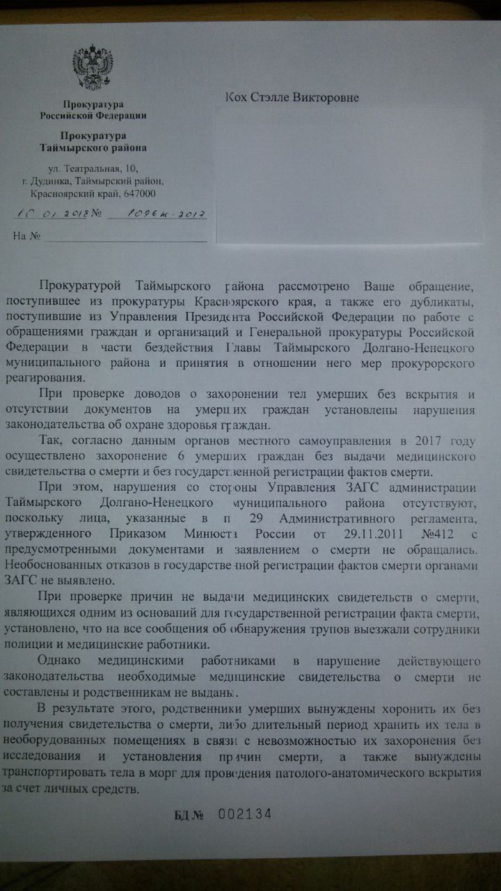 "Согласно действующему законодательству вне зависимости от места смерти тело доставляется в морг правоохранительными органами или медицинскими учреждениями. Эта процедура совершается бесплатно, то есть за счет средств государственных органов", – говорится в документе за подписью заместителя прокурора Таймыра Вячеслава Мерзялкова.