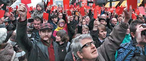 Демонстранты показывают «красную карточку»президенту Земану, Прага, 17 ноября 2014 года