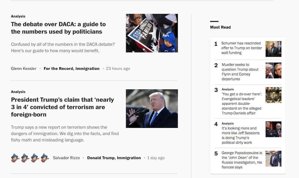 1. The Washington Post открыл рубрику “Fact Checker” в своем воскресном печатном издании (а позже и в соцсетях) для проверки заявлений политических деятелей. Редакция попросила читателей указывать на факты, которые их смущают, журналистам. Около 50% проверок фактов начинаются именно с запроса от читателя.