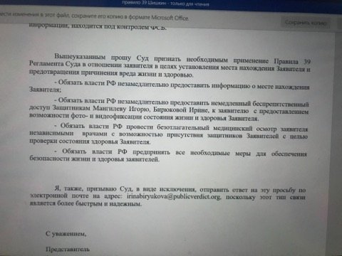 Адвокат призвала ЕСПЧ выполнить 39 правило регламента суда. Суть этой нормы заключаются в запрете государству совершать те действия, из-за которых человек может «подвергнуться реальному риску причинения существенного и непоправимого вреда».