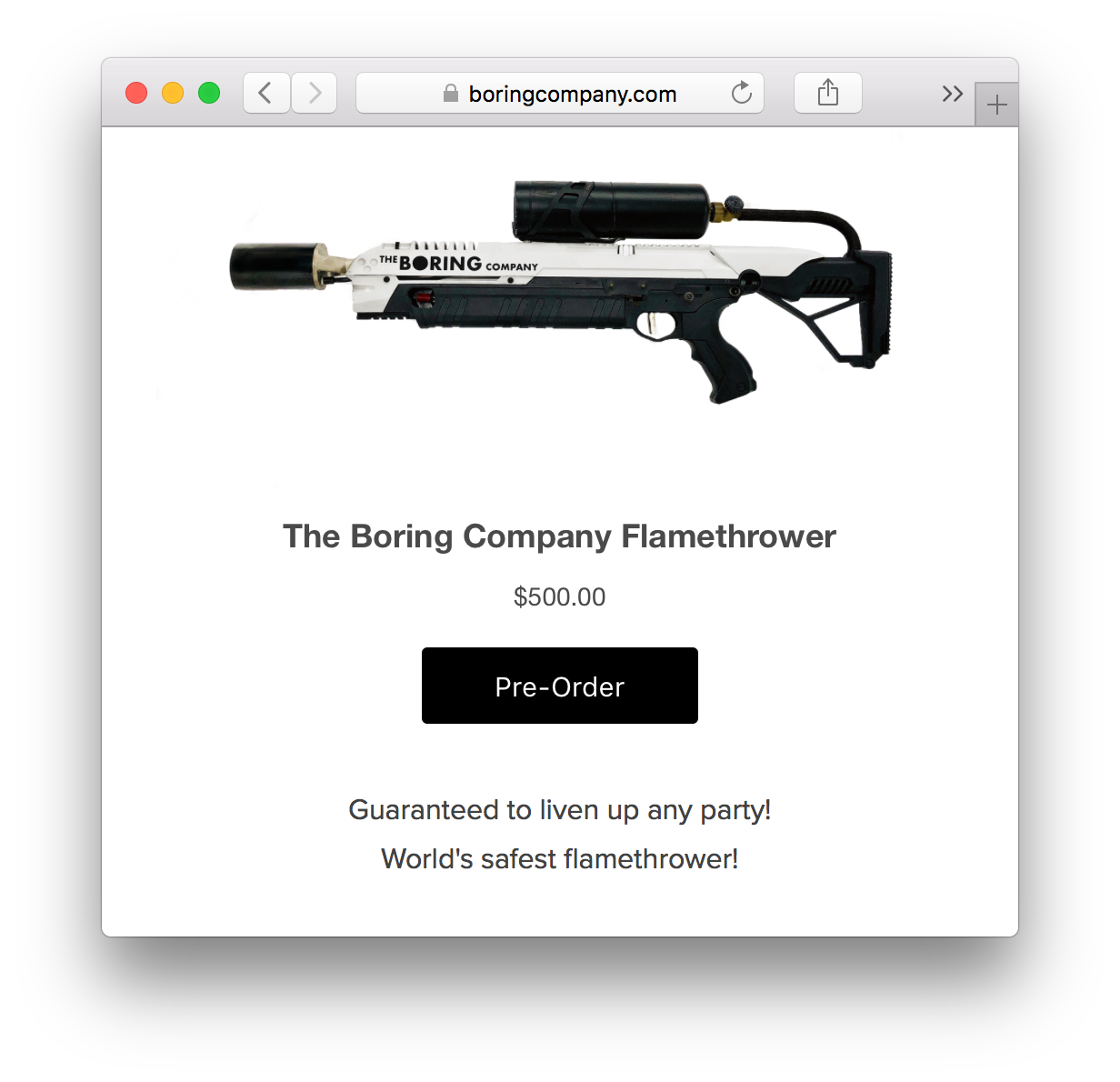 К огнемету The Boring Company предлагает также купить огнетушитель за 30 долларов. «Конечно, можно купить его и дешевле где-то еще, но у этого крутой стикер, а кнопка для удобства прямо сверху», — сказано на сайте компании.