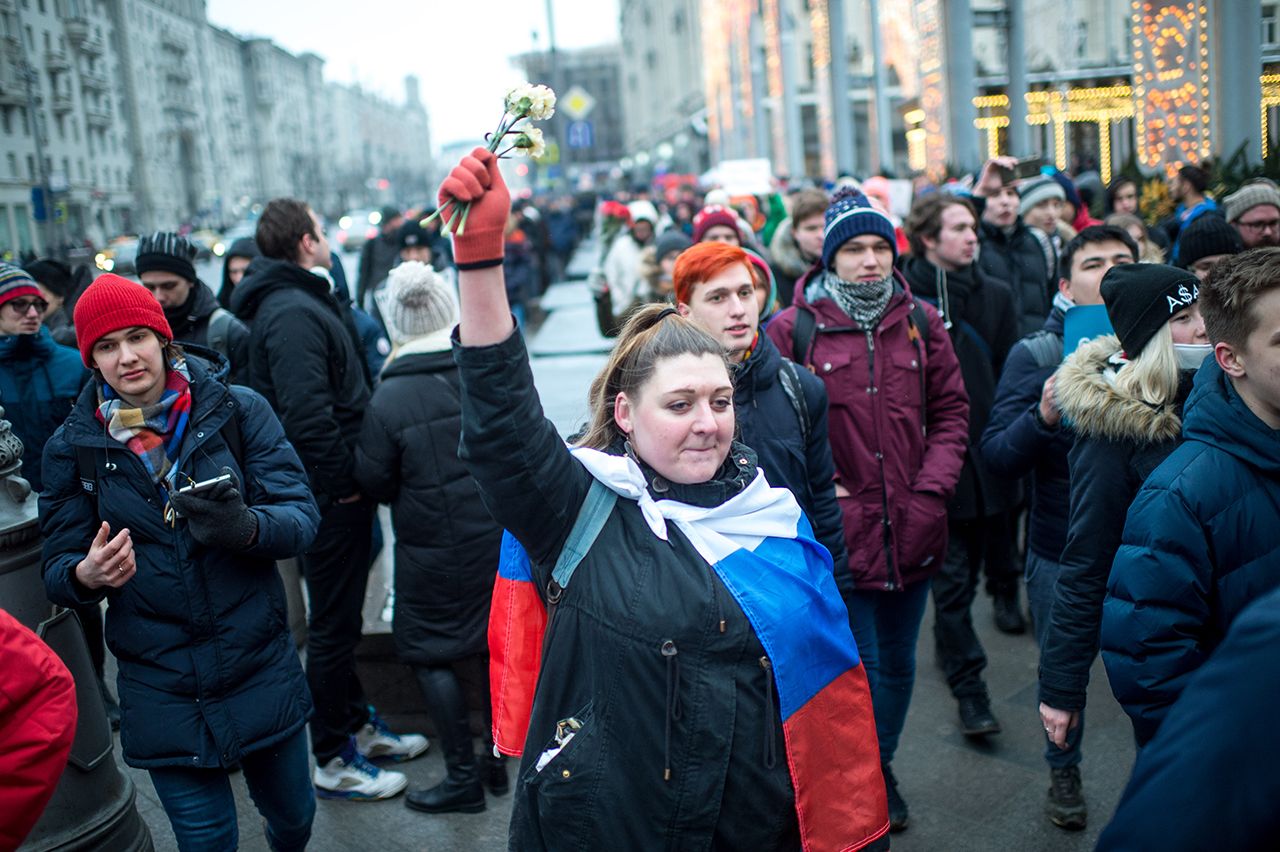 Толпа на Триумфальной площади, то есть у «Маяковской», разбилась на кружки по интересам. Подростки делали селфи на фоне полицейских и обсуждали, как быстрее набрать подписчиков на ютьюбе; люди постарше спорили, когда и как Путин покинет пост президента. «У оппозиции нет лидера, кроме Навального, который мог бы объединить и левых, и правых», — рассказывал друзьям кудрявый молодой человек лет восемнадцати.