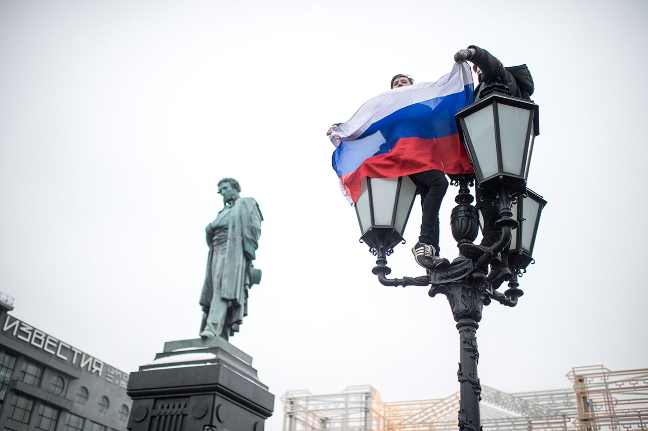 Полиция разглядывала Пушкинскую площадь, где за полчаса до официального начала протестной акции в поддержку «Забастовки избирателей» уже собрались полсотни граждан. Они не скандировали лозунгов и не держали плакатов, только у одной девушки лет двадцати в руках был свернутый российский флаг. В толпе обсуждали российско-украинский кризис и спорили: голосовать за Грудинина — это «зашквар или нормально»? (Беспартийный Павел Грудинин — кандидат в президенты от КПРФ.)