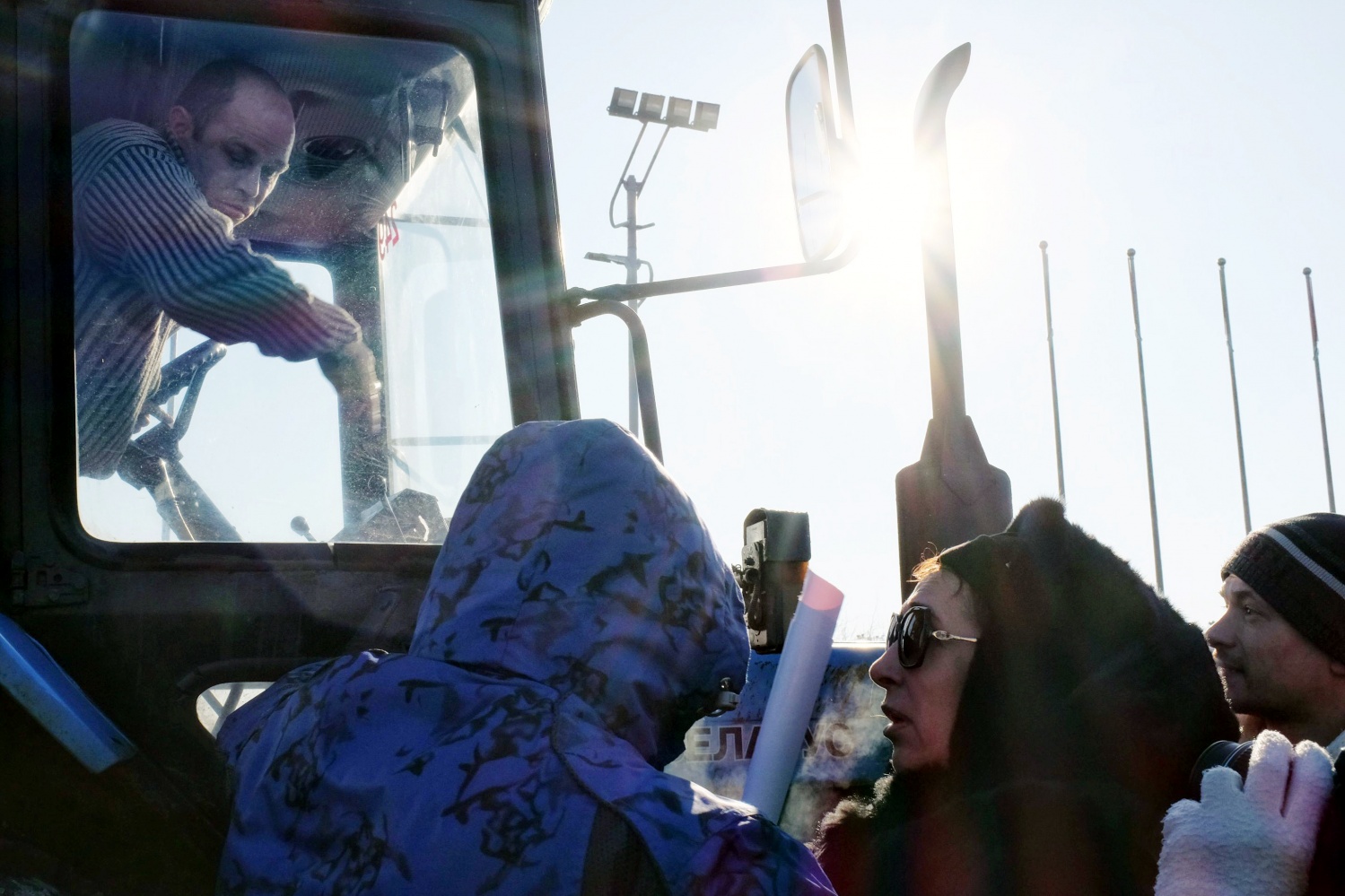После того как митингующие после «прогулки» возвращаются на площадь, неожиданно начинает работу снегоуборочная техника — тракторы движутся по кругу (убирать-то почти нечего), один из их пытается раздавить ковшом небольшой кусочек льда на асфальте. Толпа смеется. «Тракторы из цирка!» — кричат протестующие и сдвигают ограждения, отделяющие их от техники. Потом люди выходят в центр площади с плакатами, вокруг них кружат тракторы, одному из них митингующие перекрывают дорогу, но после короткой перебранки с водителем расходятся.