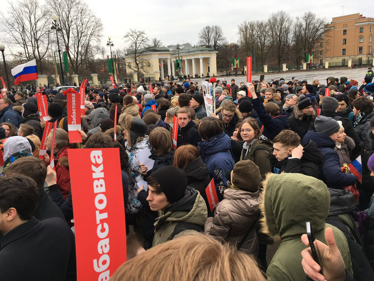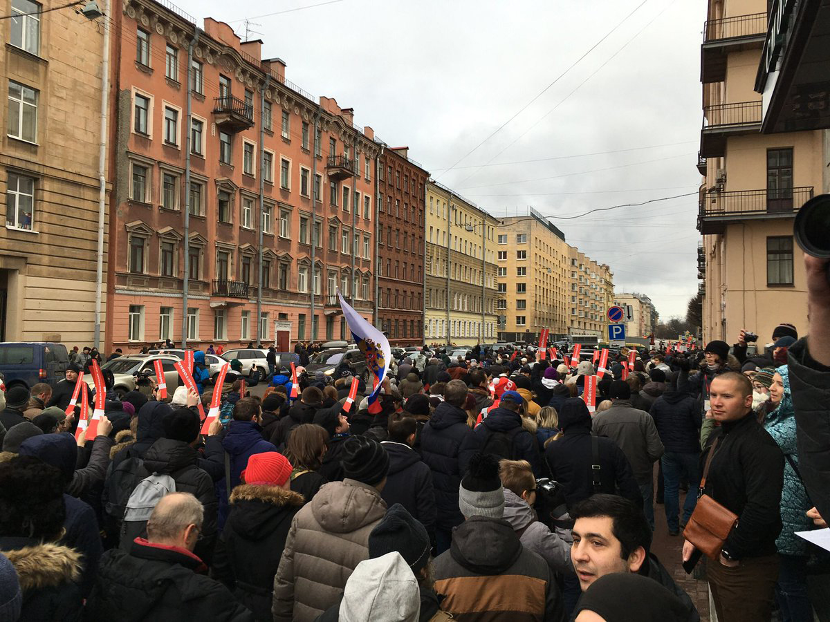 К 14 часам на площади Пролетарской диктатуры перед Смольным, где находится администрация города, собрались несколько тысяч человек. Больше всего полицию заботил вопрос защиты самого Смольного — он был оцеплен плотной цепочкой омоновцев, а вход перегорожен ленточкой. На дальних подступах к площади дежурили наряды ГИБДД, которые останавливали и проверяли туристические автобусы — видимо, опасались, что в них везут на митинг сторонников Навального. Ближе к месту событий стояла дорожная техника — тяжелые грузовики, которыми полиция собиралась перекрывать проезжую часть.