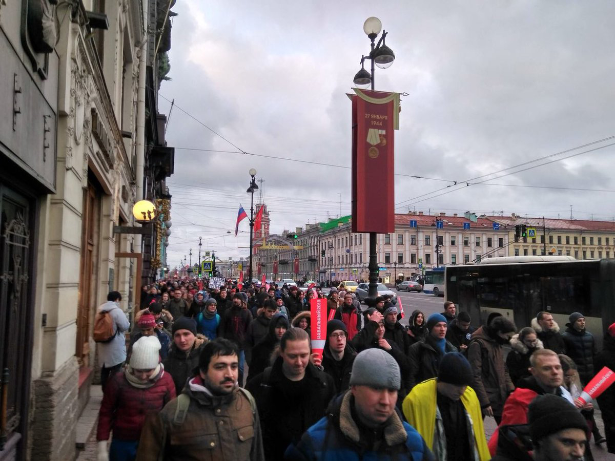 Скандируя «Путин вор» и неся над головой красные флаерсы с надписью «Навальный 20!8», около тысячи человек вышли на тротуар Невского проспекта и, не спускаясь на проезжую часть, пошли в сторону Дворцовой площади. Туда же двинулись и люди с Марсова поля.