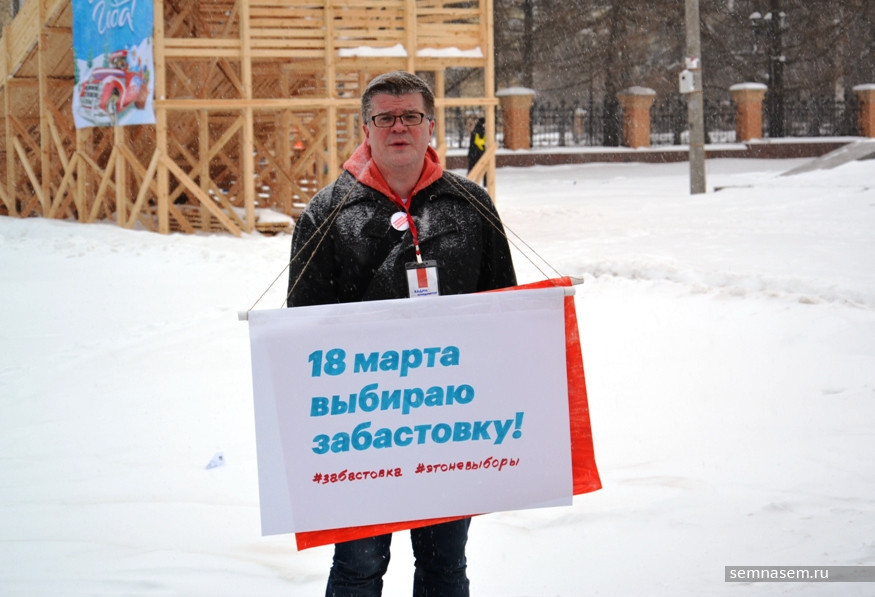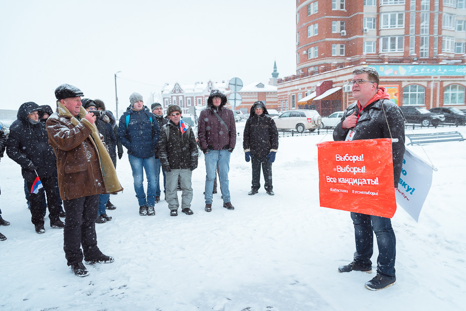 Чтобы оставаться в рамках закона, штабу пришлось ограничиться одиночным пикетом, на котором координатор предложил задать ему все интересующие вопросы по выборам президента России. Его слушали около 50 человек.