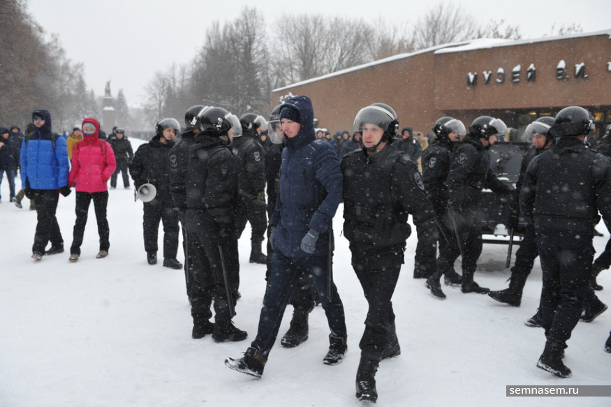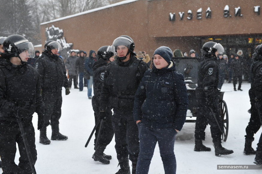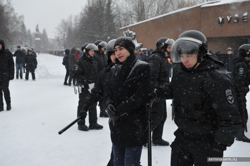Полицейский в каракулевой шапке подошел к организаторам и стал кричать в громкоговоритель: «Вы нарушаете 54-й федеральный закон! Последний раз предупреждаю!», но собравшиеся кричали ему в ответ: «Мы ничего не нарушаем, мы пришли в парк!». Начальник отошел в сторону, к нему подошли несколько людей в штатском, а со стороны дороги прибежал взвод бойцов ОМОНа в бронежилетах и с дубинками.
