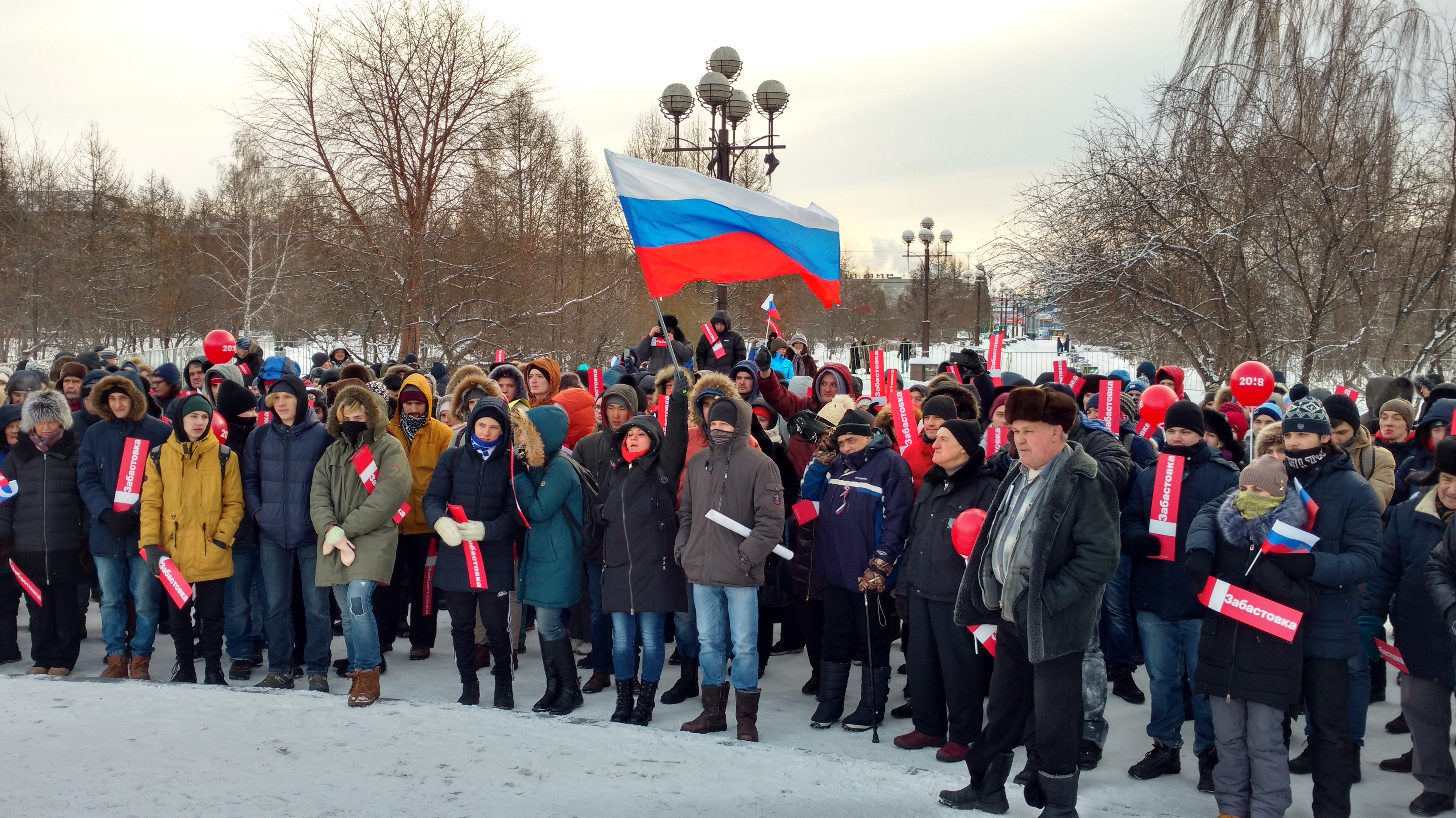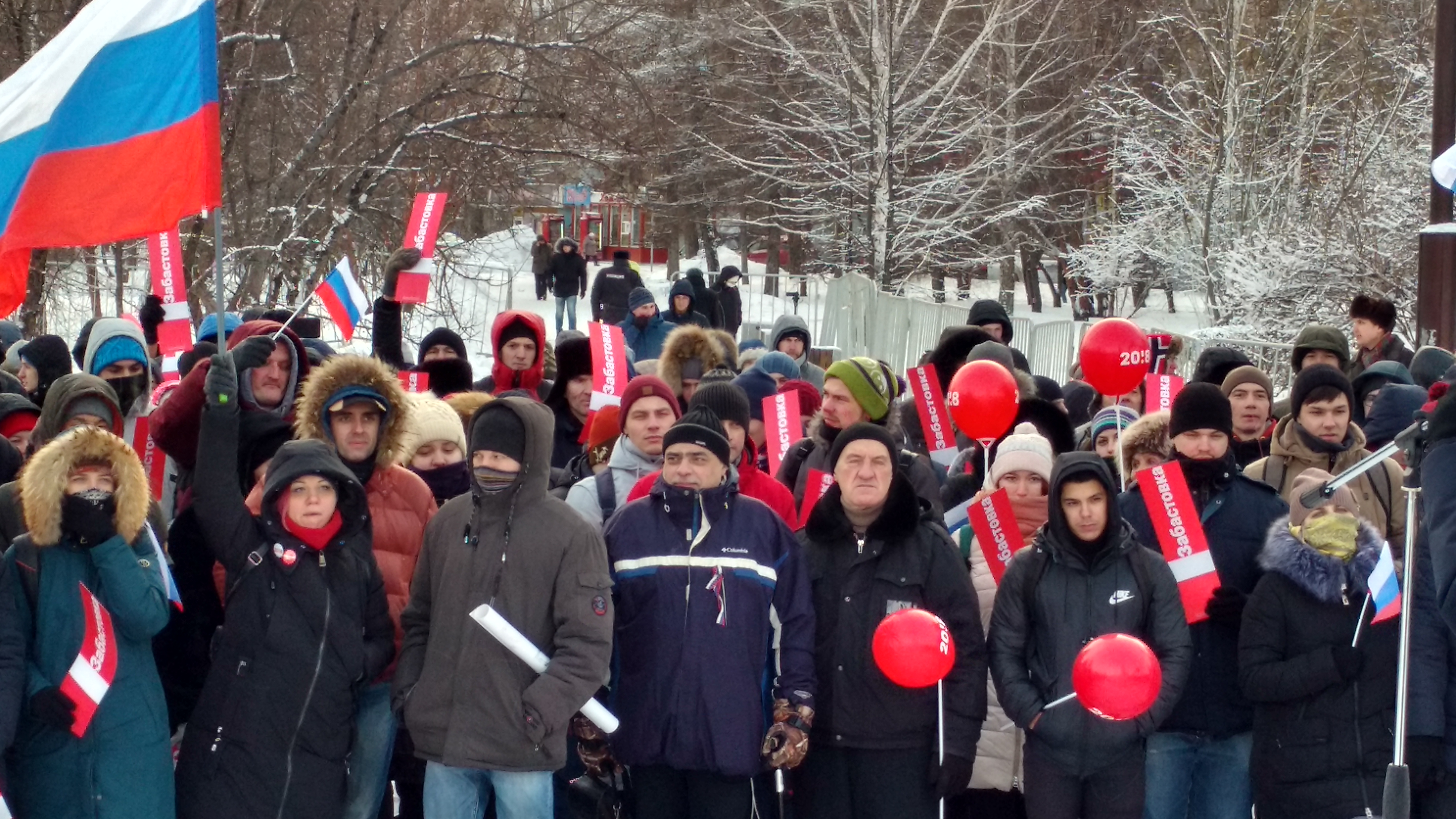 В Красноярске на акцию "забастовка избирателей" пришло около 400 человек. Сторонников Алексея Навального не остановили мороз и очень ветреная погода.