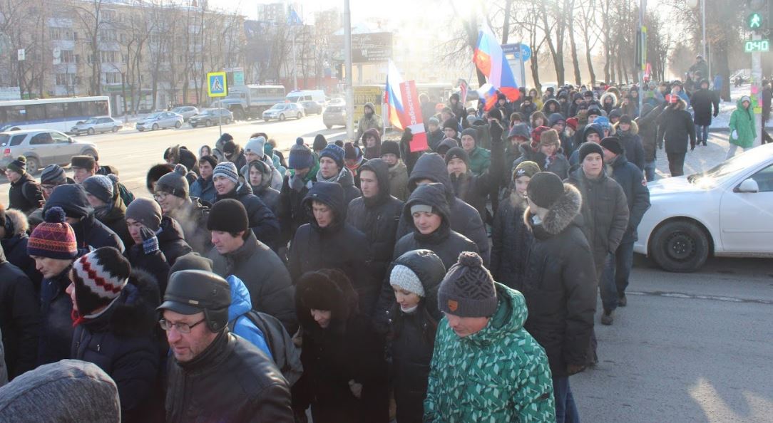 14 часов 55 минут. Колонна протестующих тронулась в обратный путь. В первые минуты многие предполагали, что шествие вернется к месту старта и там акция завершится. Однако, на перекрестке улицы 50-летия СССР и проспекта Октября колонна неожиданно поворачивает налево, по направлению к мэрии и Русскому драмтеатру. Протестующие периодически скандируют: "Россия без Путина!", "Путин — вор!", "Забастовка!". Численность идущих, практически, не уменьшилась — по самым осторожным подсчетам в колонне идет не менее 500 человек.
