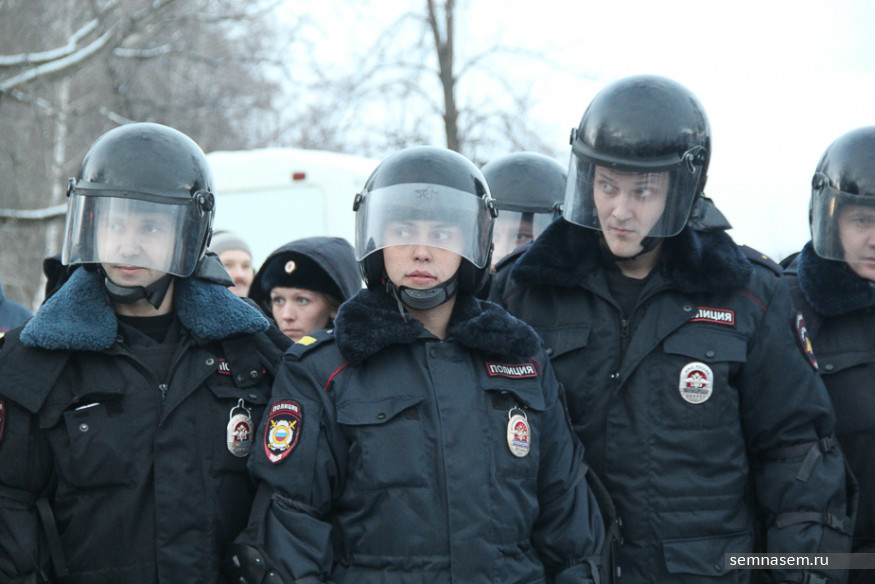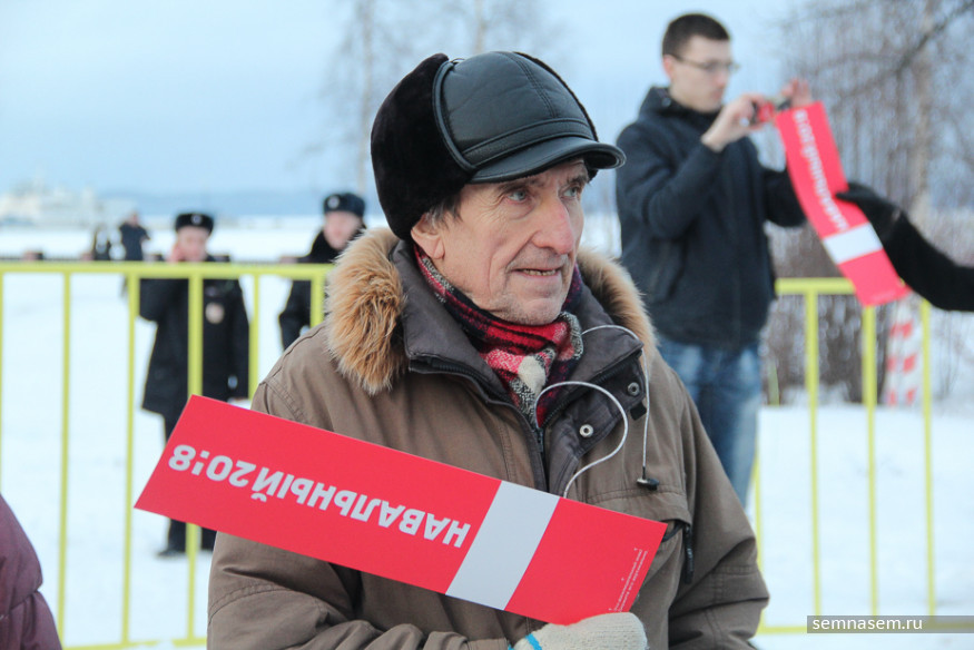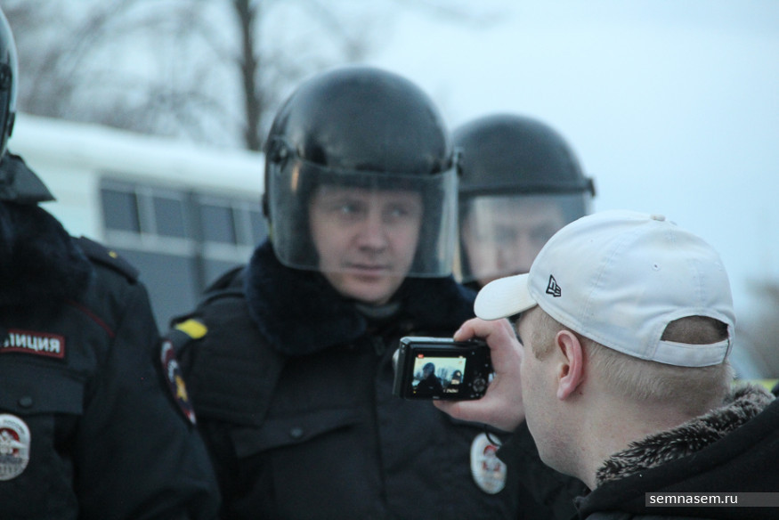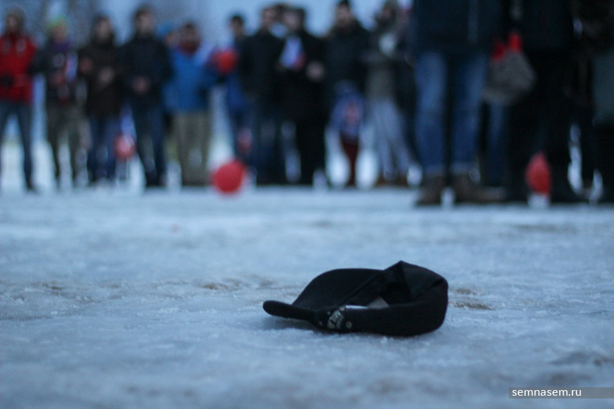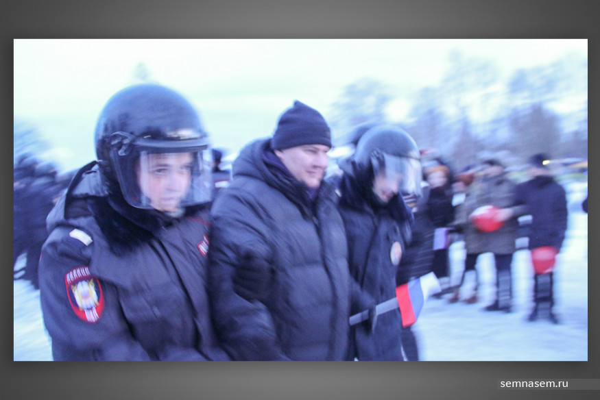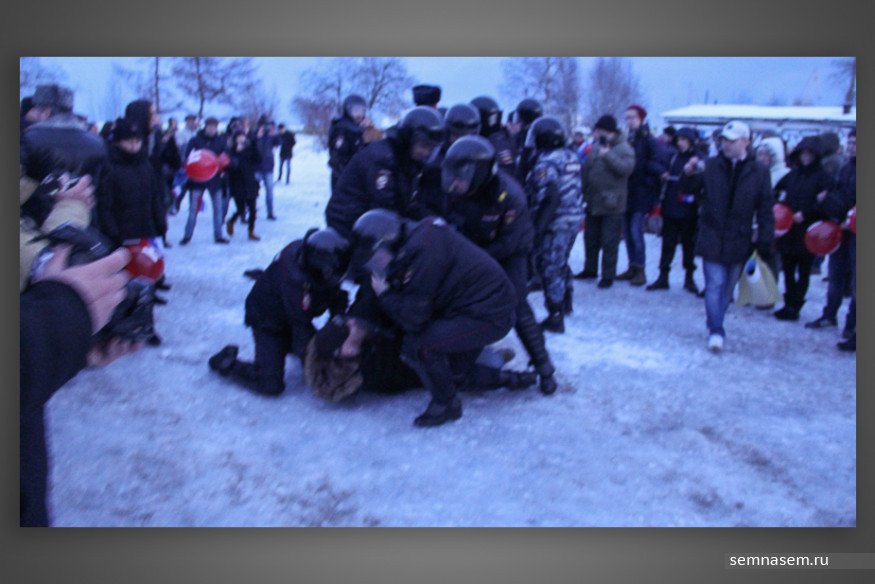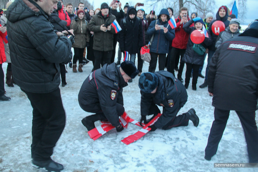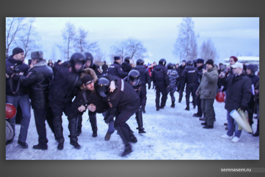 Мужчину выносят за периметр, на раскатанном до льда снегу остается лежать его черная кепка. Четвертым сотрудники правопорядка уводят известного петрозаводского активиста Виталия Флеганова.