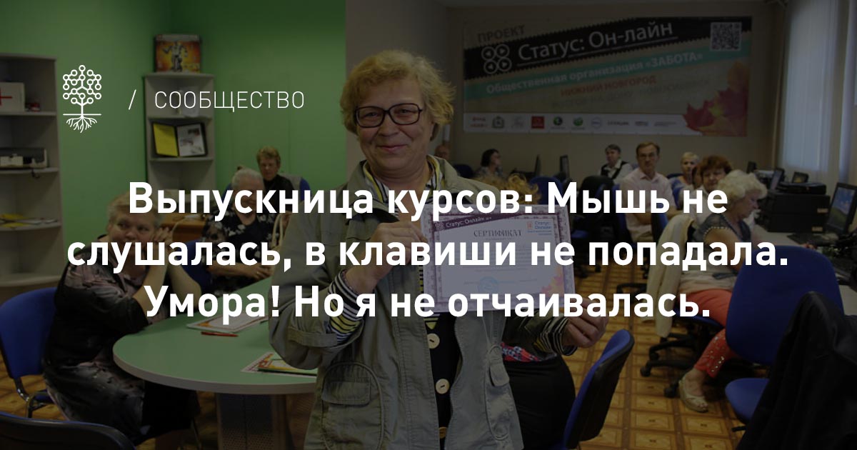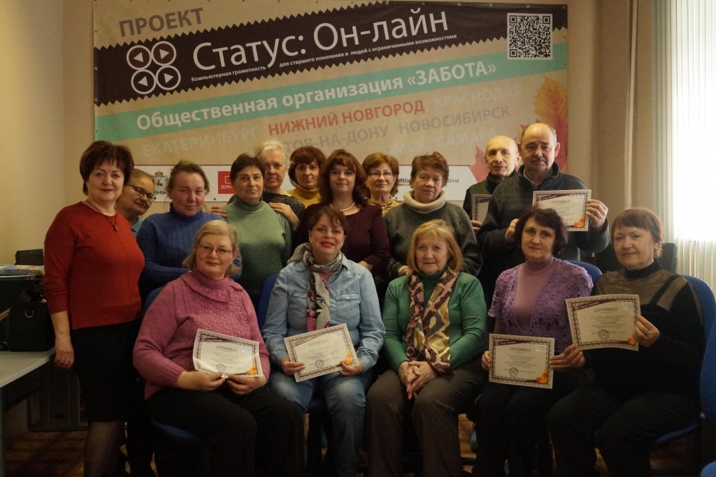 «Женщину собирались уволить, а после курсов назначили начальником. После курсов люди начинают писать стихи, один выпускник пишет книгу о своем отце (материалы и людей нашел в Интернете после курсов), многие находят родственников, друзей, начинают ездить в гости друг к другу. Для работающих курсы – возможность продлить профессиональную деятельность. Специально сделали курсы для медиков в связи с необходимостью научиться оформлять электронный больничный», – Наталья Симонова, директор организации «Забота».