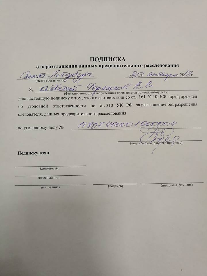 Следователь Геннадий Беляев вышел, оказался довольно-таки общительный молодой человек. Без проблем получил от меня ордер, сказал: «Вы уже в деле». Сразу предоставил на подпись подписку о неразглашении данных предварительного следствия. То есть с сегодняшнего дня о данных следствия я вынужден буду молчать — но все, что касается избиения моего подзащитного, вся новая информация будет передаваться в СМИ.