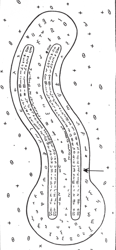 Рис. 1. Рисунок Н. К. Кольцова (1928), иллюстрирующий его гипотезу строения гигантских наследственных молекул, согласно которой каждая хромосома соматических клеток несет две молекулы с наследственными записями в виде генов. Каждая такая молекула состоит из двух зеркальных нитей. В них расположены гены (показаны индивидуальными парными символами). Стрелкой указан ген, у которого один из двух аллелей в парных нитях изменен мутацией
