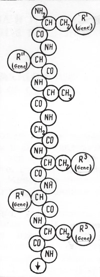 В те годы, когда Кольцов разрабывал эти гипотезы, химия полимеров была в зачаточном состоянии. Н. К. казалось, что наиболее подходящими для наследственных молкул могли бы быть белки. Соединение аминокислот через —NH—COOH— связи в полимерные структуры давало возможность думать, что именно белки могут достигать гигантской длины; в качестве примера Кольцов приводил рисунок белков фиброинов (рис. 2).