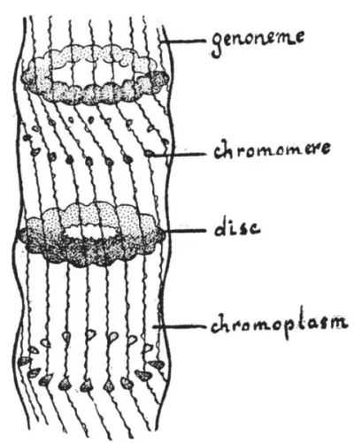 Рис. 3. Рисунок Н. К. Кольцова, показывающий структуру многоцепочечных политенных хромосом, обнаруженных в слюнных железах двукрылых. Впервые опубликован в 1934 году в журнале Science