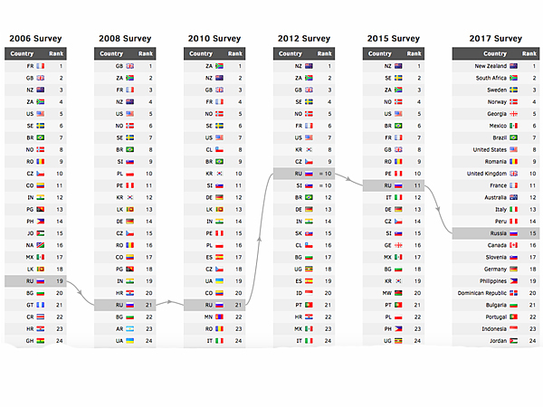 В первую группу входят 5 стран-лидеров: Новая Зеландия, Южная Африка, Швеция, Норвегия и Грузия. При этом, если первые четыре страны на протяжении нескольких исследований показывают высокие результаты, то Грузия за два года поднялась с 16 места на 5.