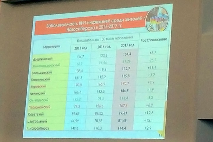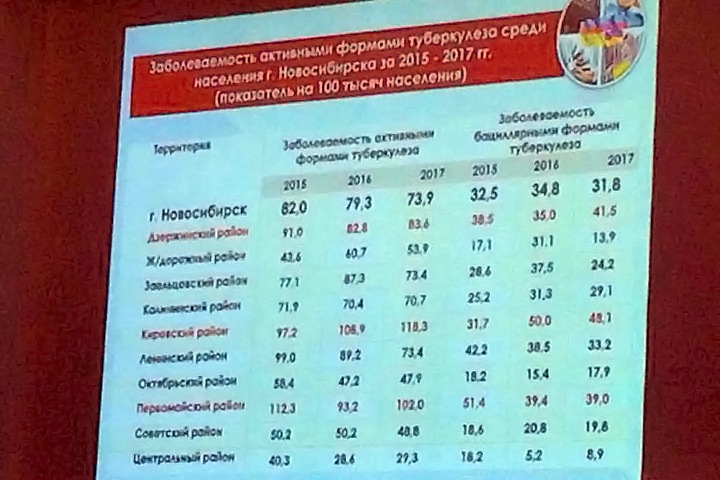 Замруководителя регионального Роспотребнадзора Лада Самойлова сделала доклад, из которого следует, что Дзержинский, Кировский и Первомайский районы города лидируют по заболеваемости туберкулезом, а последние два еще и по заболеваемости ВИЧ. Кроме того, Новосибирск дает более половины вновь выявленных случаев ВИЧ в регионе (в 2017 году в области было зарегистрировано 4011 новых заболевших, из них 2315 — в областном центре), а показатели города по заболеваемости выше и среднеобластных, и среднероссийских. При этом охват населения флюорографическими обследованиями местами совершенно недостаточен.