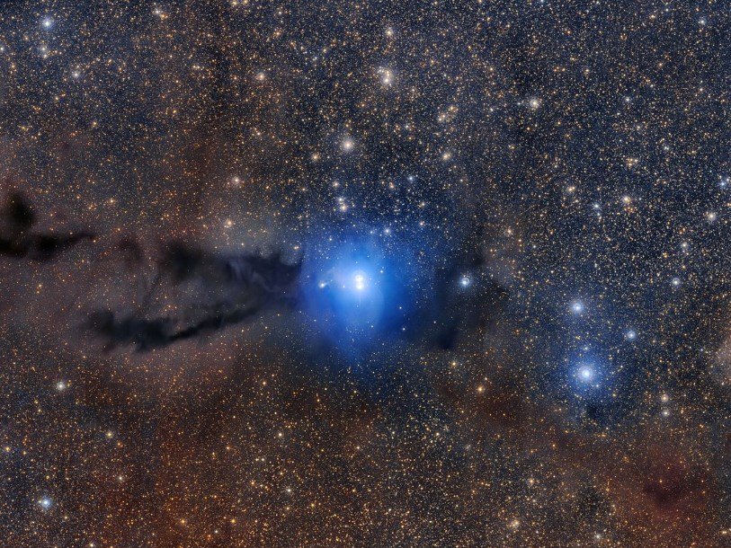 Туманность Lupus 3 неправильной формы, напоминает очертаниями змею. На снимке ее чернота контрастно выделяется на фоне яркого сияния голубых звезд в центре. Как большинство темных туманностeй, Lupus 3 – область активного звездообразования, содержащая множество протозвезд и очень молодых звезд. В участках повышенной плотности может в результате внешних воздействий начаться гравитационное сжатие, в процессе которого растет температура и давление, и наконец в экстремальных условиях в ядре сжимающегося облака рождается протозвезда.