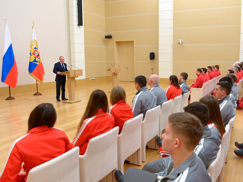 Встреча с российскими спортсменами – участниками XXIII Олимпийских зимних игр 2018 года в Пхёнчхане / kremlin.ruПутин также извинился перед спортсменами за то, что им пришлось пережить в связи с допинговым скандалом. Этот скандал начался после появления доклада комиссии Всемирного антидопингового агентства под руководством Ричарда Макларена; доклад во многом основан был на показаниях Григория Родченкова, бывшего главы Московской антидопинговой лаборатории, который рассказывал о существовании в России поддерживаемой государством допинговой системы.