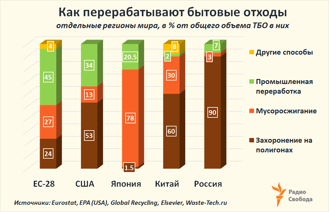 А по оценкам профильного российского форума WasteTech, лишь 3% ТБО в России сжигается и еще 7% поступает в промышленную переработку. Эти данные мы и взяли для сравнительного графика: