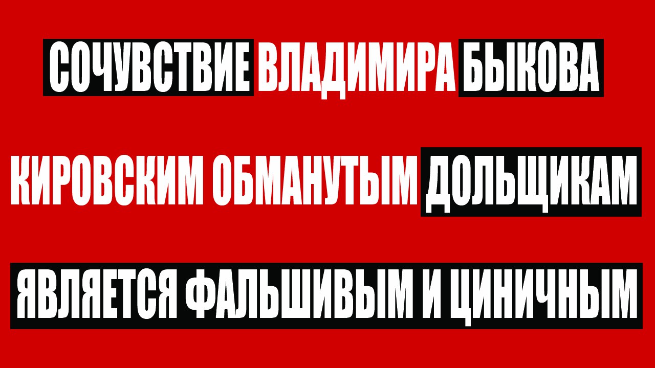 Руководитель регионального отделения «Единой России», и, по совместительству спикер Законодательного Собрания Владимир Быков недавно заявил, что проблема кировских обманутых дольщиков находится «под контролем» партии власти. Фальшивые и циничные слова.