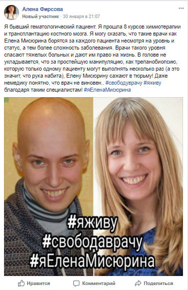 Пациенты, перенесшие гематологические заболевания, запустили в Facebook флешмоб в поддержку врача-гематолога Елены Мисюриной, которую обвиняют в оказании услуг, не отвечающих требованиям безопасности.