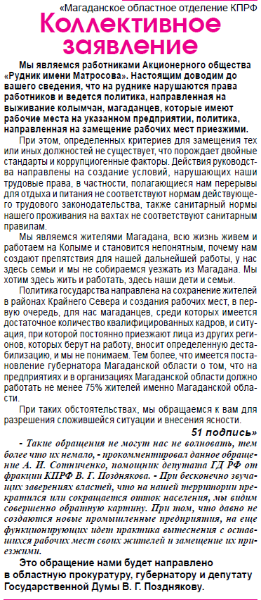 Сотрудники Рудника им. Матросова в Магадане – одного из крупнейших золотодобывающих предприятий в России – написали открытое письмо, в котором жалуются на условия труда. Коллективное заявление было опубликовано в январском номере газеты "Колымская Искра", которую выпускает магаданское отделение партии КПРФ.