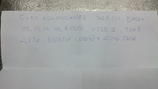 «Я сегодня приехал — меня не было два дня дома. Приезжаю домой, поднимаюсь — записка у меня на звонке в квартире: "Сука красножопая, удали видео, не лезь не в свое. У тебя тоже дети, береги семью и дочь свою"», — рассказал Кузнецов.