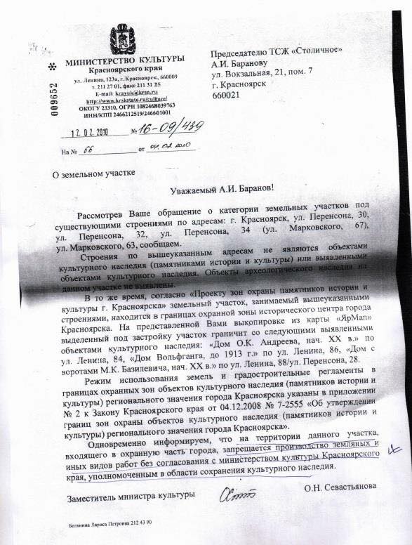 В том, что не существует документов, которые позволили бы защитить усадьбу от сноса, Александр Баранов не вполне прав. Так, еще в 2010 году на его же запрос был получен ответ из краевого министерства культуры, в котором указано: хотя дома 30, 32, 34 на Перенсона сейчас не являются выявленными объектами культурного наследия, земля, на которой они стоят, находится в границах охранной зоны исторического центра Красноярска. А это значит (цитируем документ), что здесь запрещено "производство земляных и иных видов работ".