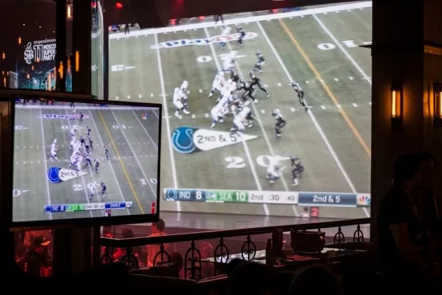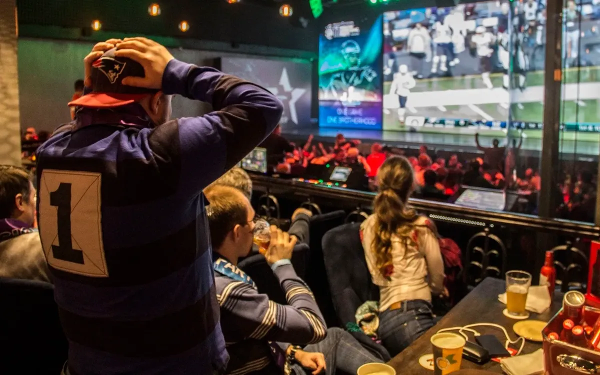 В зале, где идет трансляция, большой экран и музыканты. На входе выдают фиолетовый шарф с символикой «Супербоула». Место похоже на большую американскую столовую — люди в форме американских футболистов, в бейсболках или шапках пьют пиво и едят за длинными столами. Пиво бесплатное и безлимитное. У меня на руке розовый браслет с надписью: «Одна игра — одно братство» на английском, который дает право заказать еду на 1000 рублей.
