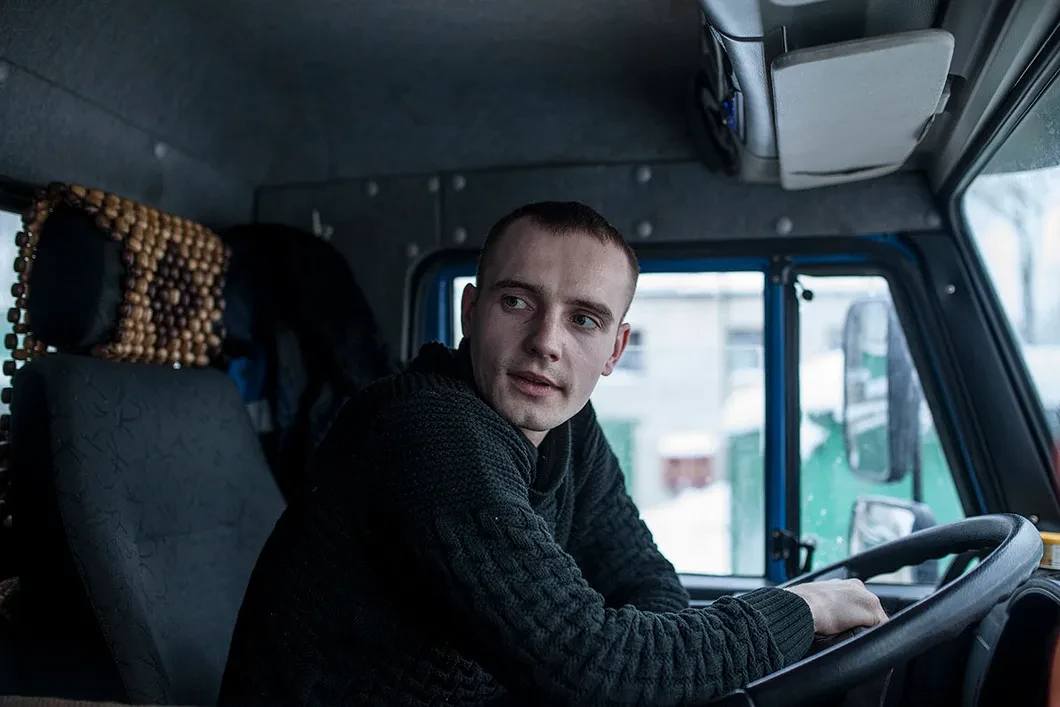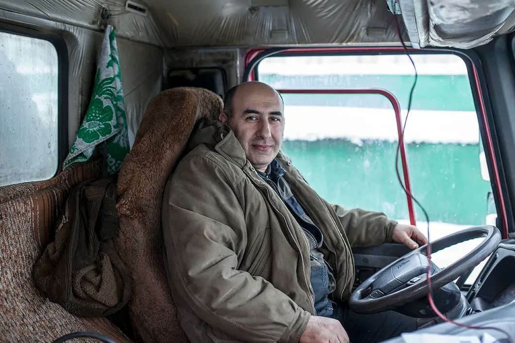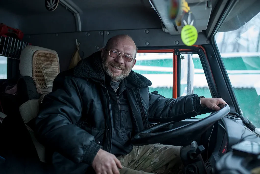 Еще один водитель, который пустил нас погреться к себе в кабину, — Андрей. Рыжая борода с сединой, затемненные очки, лучезарная улыбка — хоть и спал последние три дня по четыре часа и в экстремальных условиях.