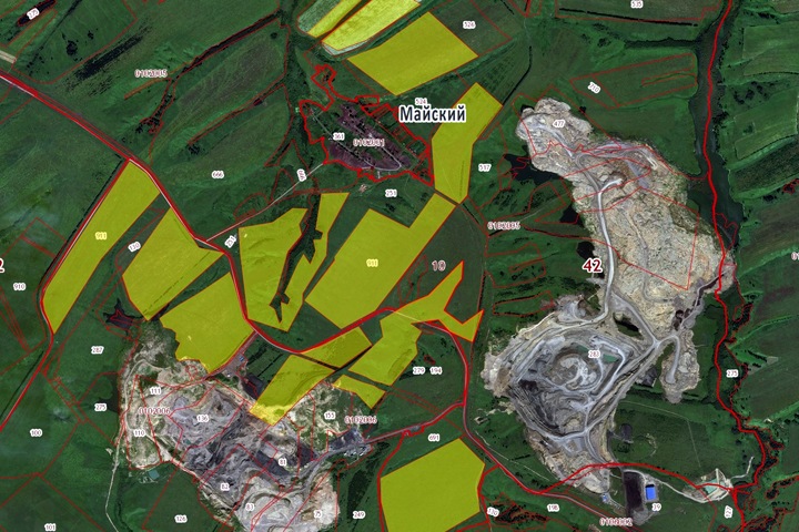 Площадь самого большого участка составляет 567,5 га. Его кадастровая стоимость 9,5 млн рублей. Территория, по данным Росреестра, с одной прилегает к поселку Майский, с другой — к угольным разрезам.