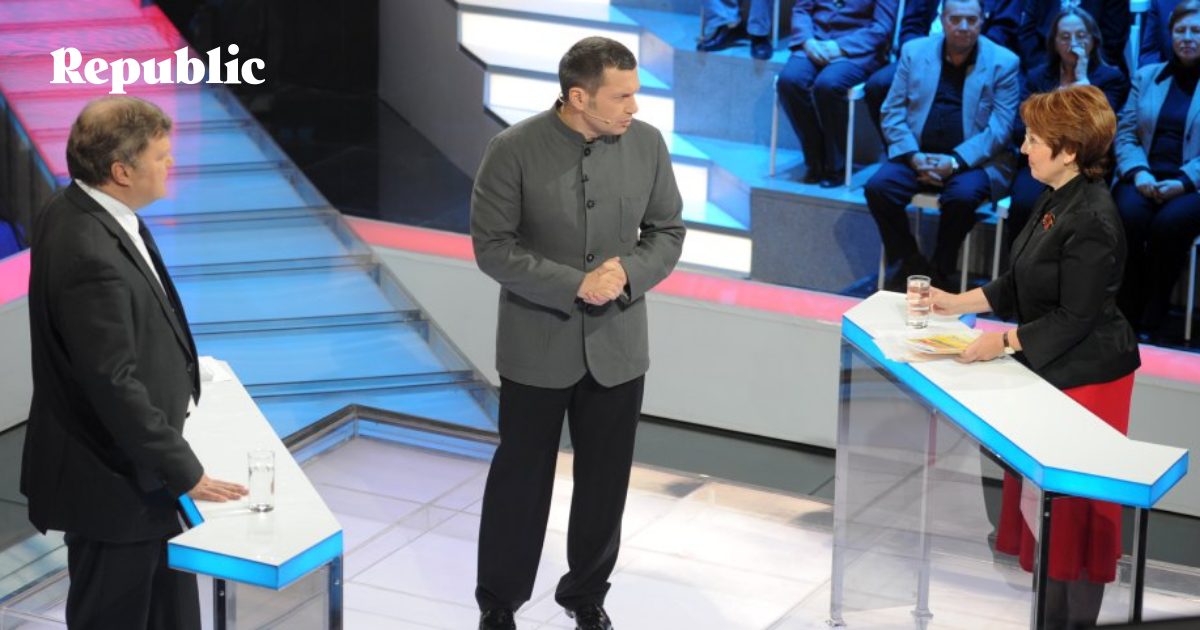 Сергей Митрохин, ведущий программы «Поединок» Владимир Соловьев и Оксана Дмитриева, дебаты на телеканале «Россия 1». Фото: Владимир Астапкович / РИА Новости