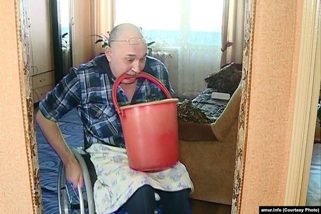 Инвалид-колясочник из амурского села Екатеринославка Юрий Вакуленко каждый день сливает воду из батарей, держа в зубах ведро воды. Спускать воду и воздух инвалиду I группы приходится, чтобы не перемерзла система отопления во всем доме.