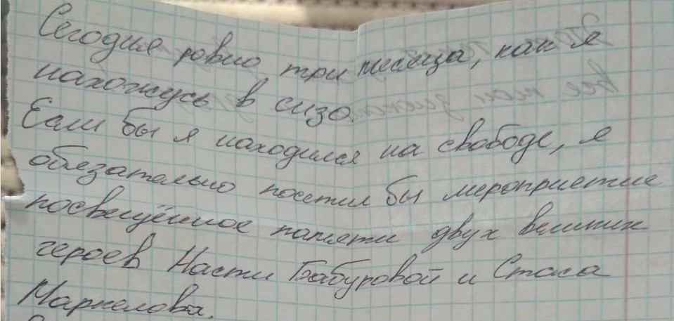 Письмо Ильи Шакурского своей подруге: «Сегодня, ровно три месяца, как я нахожусь в СИЗО. Если бы я находился на свободе, я обязательно посетил бы мероприятие, посвященное памяти двух великих героев — Насти Бабуровой и Стаса Маркелова. Сейчас мы находимся в ситуации, когда как никогда нам не хватает этих людей. Они боролись против несправедливости и помогали людям, которые попали в очень сложные жизненные ситуации. Я искренне надеюсь, что мы с помощью наших друзей, близких и просто не равнодушных людей выйдем из этой истории, полной непонимания и несправедливости! Добро победит! 19.01.18 Этот текст должны увидеть все мои знакомые и друзья».