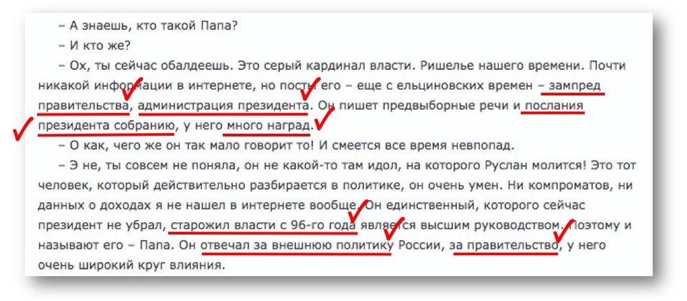 Доказывая, что человек из инстаграма и есть вице-премьер Приходько, ФБК ссылается на книгу Насти Рыбки, в которой она описывала в том числе и поездку на яхте, на которой был «Руслан» и «Папа». Сравнив биографию Приходько и «Папы», сотрудники фонда пришли к выводу, что это один человек, а «Руслан» — это Дерипаска.